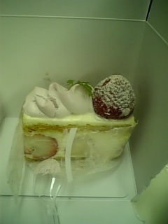 写真では非常に分かりにくいと思いますが、苺がどでんと載っているのですよ。ミルフィーユな感じでパイ生地なんですけど。あ、間は全部苺とクリーム。
