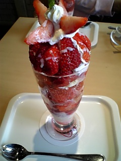 苺以外は、上から生クリーム→バニラアイス→ストロベリーシャーベット→ストロベリージャム→練乳(?)って感じでしたね。