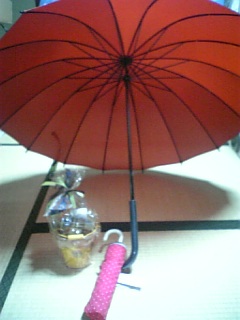 手前の小さい傘(ピンクに写ってますが、赤で、白い小さな水玉模様です)と、お菓子がK太さんから頂いたものです。