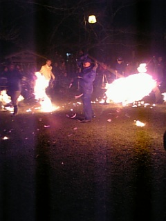 茅の束の真ん中に紐を結んで、茅に火をつけて紐を持ってグルグルと回すんです。