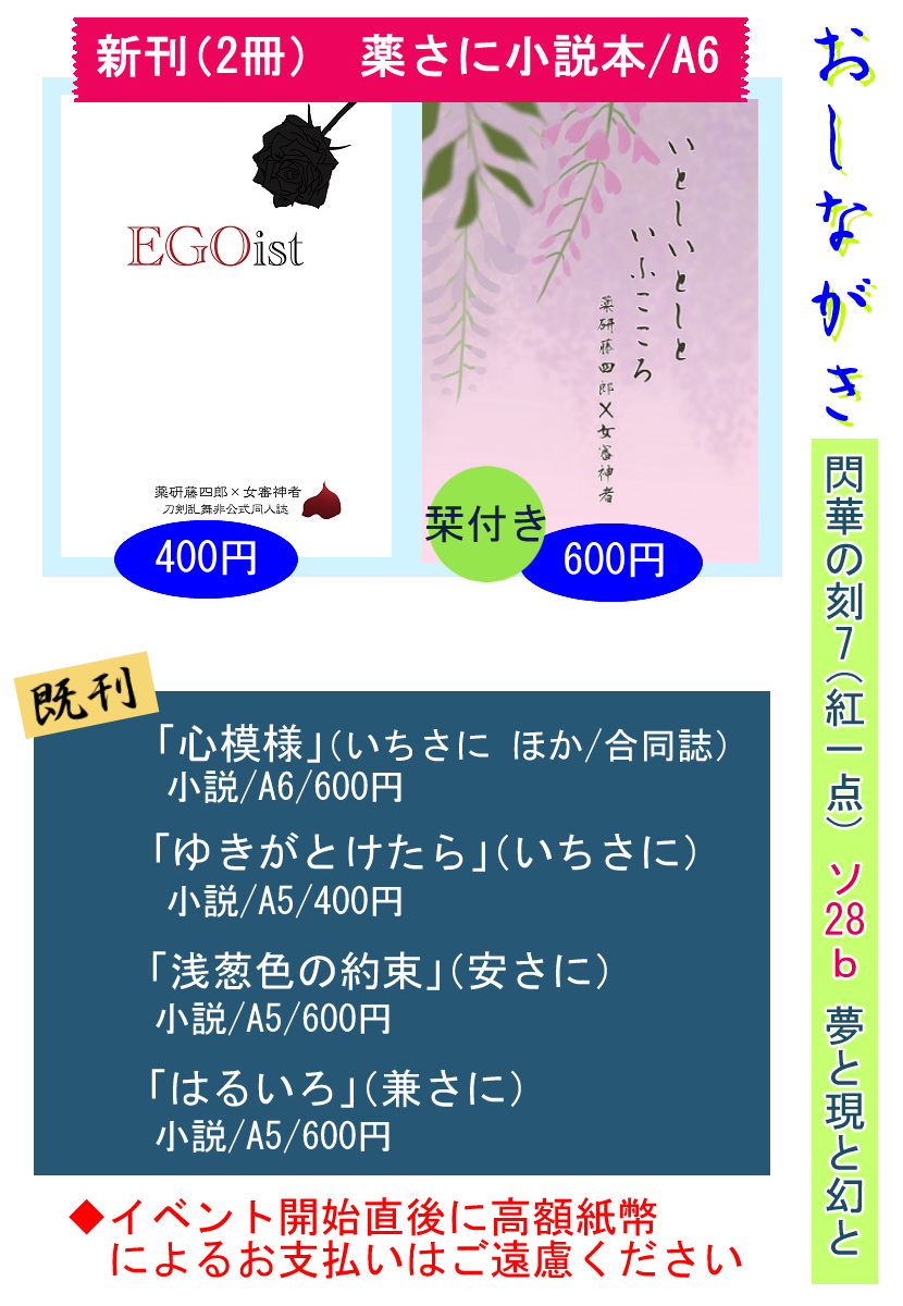 明々後日、7/3に東京ビッグサイトで開催される閃華の刻7に「夢と現と幻と」でサークル参加します。
